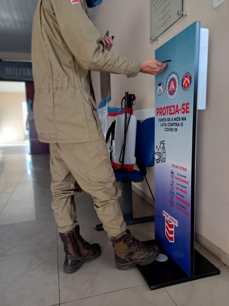 No intuito de conter o avanço do novo coronavírus, a 8ª CIPM/Itapetinga adquiriu alguns itens que ajudarão prevenir o avanço da referida doença entre os policiais da Unidade. Nesta segunda (13/07), foi instalado na entrada da área administrativa do quartel um “totem” que, ao pisar em um pedal, dispensa álcool em gel para a higienização das mãos.
