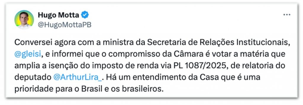 “Reafirmo que há um entendimento da Câmara de que a ampliação da isenção do Imposto de Renda é uma prioridade para o Brasil e para os brasileiros”, escreveu em publicação no X, antigo Twitter.