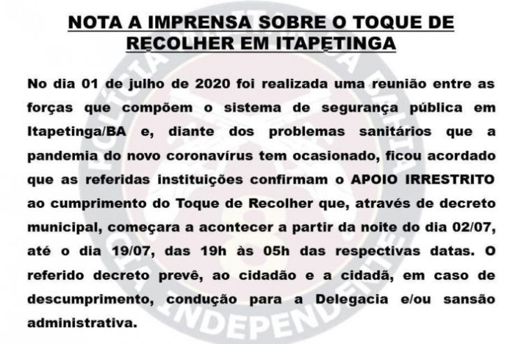 8ª Companhia Independemte de Polícia Militar (CIPM) emite nota á imprensa sobre toque de recolher no município de Itapetinga