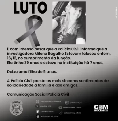 A policial Milene Bagalho deixa uma filha de 5 anos. A Polícia Civil expressou luto pela morte da investigadora durante o trabalho.