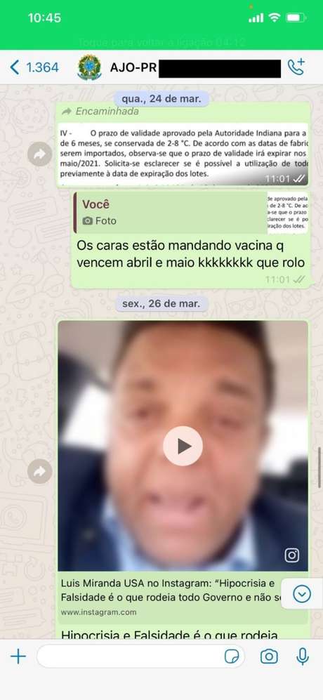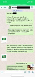 O aviso foi enviado às 12h54 do dia 20 de março ao número de celular de um ajudante de ordem do presidente. Como resposta, o auxiliar de Bolsonaro responde com uma bandeira do Brasil. Uma hora depois, Miranda insiste: “Não esquece de avisar o PR (presidente). Depois não quero ninguém dizendo que eu implodi a república. Já tem PF e o c… no caso. Ele precisa saber e se antecipar”. A resposta é outra bandeira do Brasil.