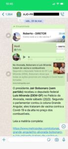 Às 16h, Miranda informa ao auxiliar do presidente que estava “a caminho”. No mesmo dia, Bolsonaro recebeu o deputado no Palácio da Alvorada. O encontro foi registrado nas redes sociais por Miranda, que na ocasião disse ter ido tratar de combustíveis e vacinas.