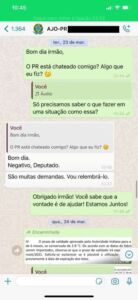 Passados dois dias, o deputado voltou a procurar o auxiliar. “Pelo amor de Deus… isso é muito sério!”, escreveu Miranda no dia 22. Sem resposta, ele insiste no dia seguinte.”Bom dia irmão, o PR está chateado comigo? Algo que fiz?”. O auxiliar do presidente responde: “Negativo, deputado. São muitas demandas. Vou relembrá-lo”.