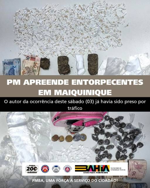 Na tarde deste sábado (03), por volta das 14h30, uma equipe da 8ªCIPM de Maiquinique realizava patrulhamento pela cidade quando identificou um indivíduo em atitude suspeita na Rua Rui Barbosa, no Centro. O homem carregava uma bolsa e, ao perceber a aproximação policial, tentou fugir, mas foi rapidamente interceptado. Durante a abordagem, os agentes encontraram no interior da bolsa várias porções de entorpecentes embaladas para comercialização, totalizando aproximadamente 300 gramas de crack e 50 gramas de maconha. O suspeito já possuía antecedentes pelo crime de tráfico de drogas.