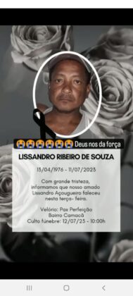 É com profundo pesar que o Itapetinga 24 horas informa o falecimento de Lissandro Ribeiro de Souza, conhecido como Lissandro Açougueiro, ele tinha seu açougue localizado na rua Jequiriça, no bairro Primavera, Lissandro estava internado no Hospital Cristo Redentor, e veio a óbito na tarde desta terça-feira (11). O corpo está sendo velado no cerimonial Pax Perfeoção.