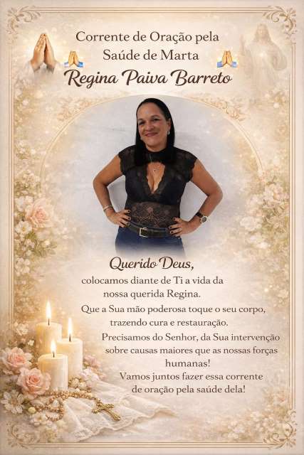 Que a misericórdia divina envolva Regina com Sua paz e lhe conceda restauração, serenidade e coragem para enfrentar cada desafio. Que familiares e amigos sejam fortalecidos pela fé, mantendo viva a esperança de dias melhores. Unamos nossos corações em oração, acreditando no poder do bem, da união e do amor que cura.