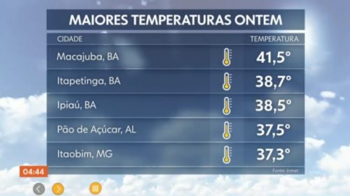 No Jornal Hora Um, da Rede Globo, apresentado na manhã (madrugada) desta quarta-feira (20), foram destacadas na previsão do tempo as temperaturas mais altas do Brasil, na terça (ontem), com cidades baianas liderando o ranking desse calor intenso de fevereiro.