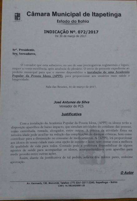 Ainda no pequeno expediente o parlamentar destacou indicação de Nº 072/2017 de sua autoria, sugerindo ao Poder Executivo Municipal a instalação de uma Academia Popular da Pessoa Idosa (APPI) para atender exclusivamente as pessoas da terceira idade.