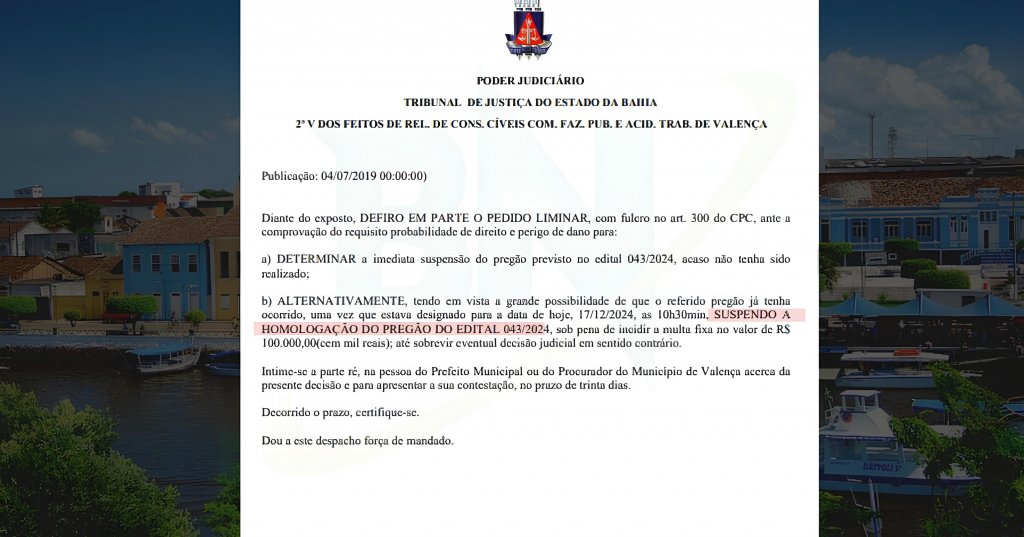 A Justiça atendeu a um pedido da Comissão de Transição do prefeito eleito Marcos Medrado (PV) e suspendeu a licitação para contratação de serviços de limpeza urbana e manejo de resíduos sólidos de Valença. A decisão, que tem caráter liminar, impede a realização da sessão de abertura das propostas, inicialmente marcada para esta terça-feira (10).
