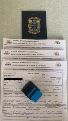 Foram aprendidos o carimbo do médico Dr. M.S. e três Fichas de Atendimento Ambulatorial e Emergencial de pacientes preenchidos, carimbados e assinados pelo investigado.