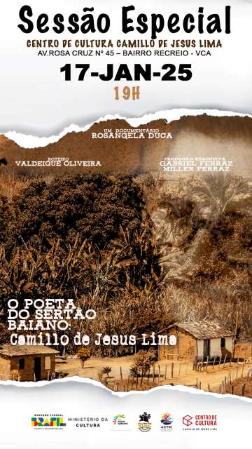 Sessão Especial do Documentário sobre a história do professor e escritor Camillo de Jesus Lima terá exibição gratuita no Centro de Cultura Camillo de Jesus Lima em Vitória da Conquista, no dia 17 de janeiro, às 19h.