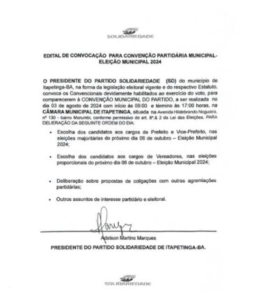 Solidariedade: convocação para convenção partidária municipal eleições 2024! 22 de julho de 202422 de julho de 2024 Marlon Araújo Eleições 2024 O Presidente municipal do partido solidariedade em Itapetinga Adilson Martins, emitiu na noite desta segunda-feira, 22 de julho, nota a imprensa divulgando o edital de convocação para convenção partidária municipal eleições 2024.